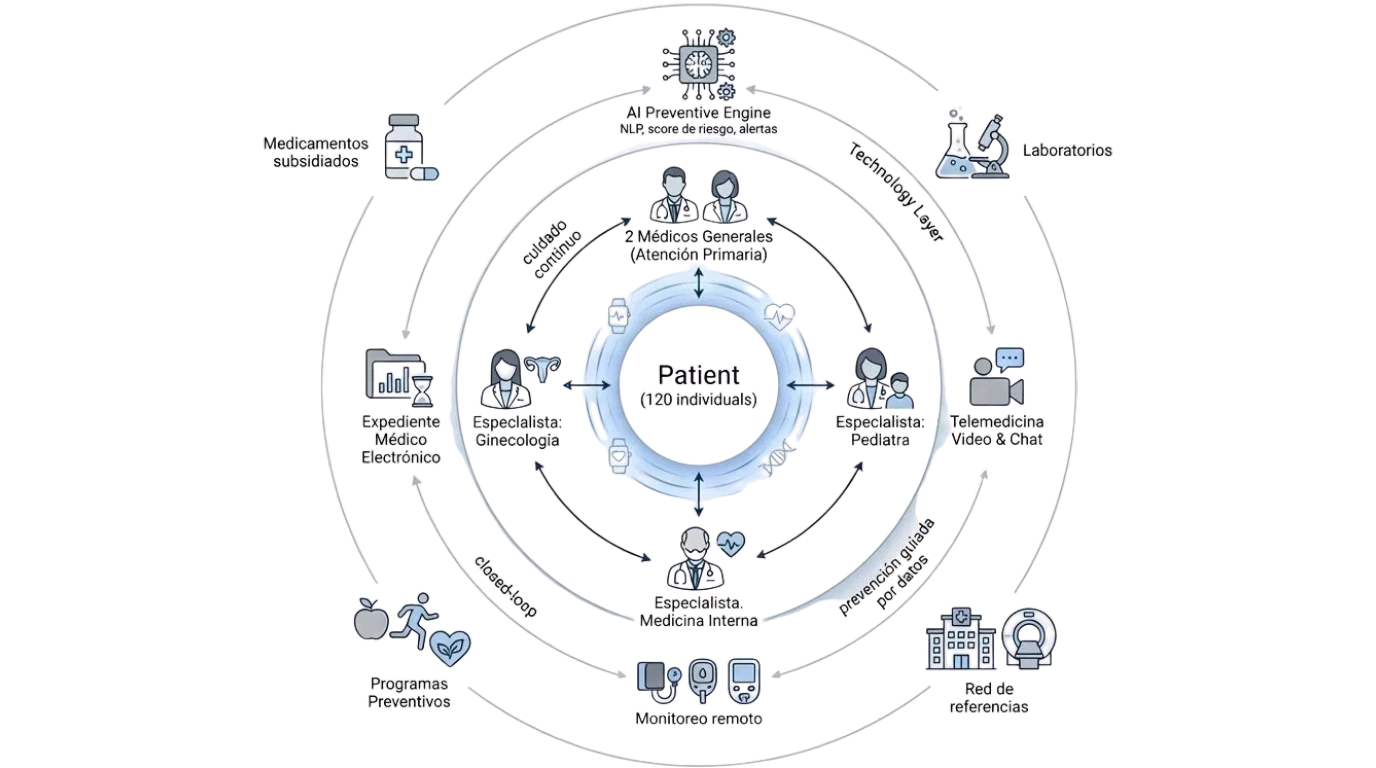 El modelo MEDICAP combina un equipo médico pequeño y dedicado con tecnología de IA clínica. No atendemos emergencias — prevenimos que ocurran. Cada paciente tiene un expediente longitudinal, un médico asignado y seguimiento activo entre consultas.